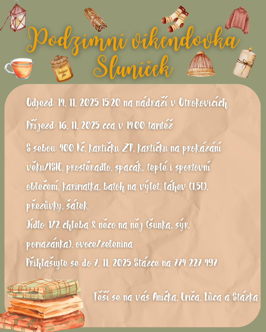 Zveme všechna Sluníčka na naši tradiční podzimní víkendovou akci. Letos pojedeme do Uherského Hradiště na asociační chalupu. Přihlašujte se do ... pokračovat ve čtení