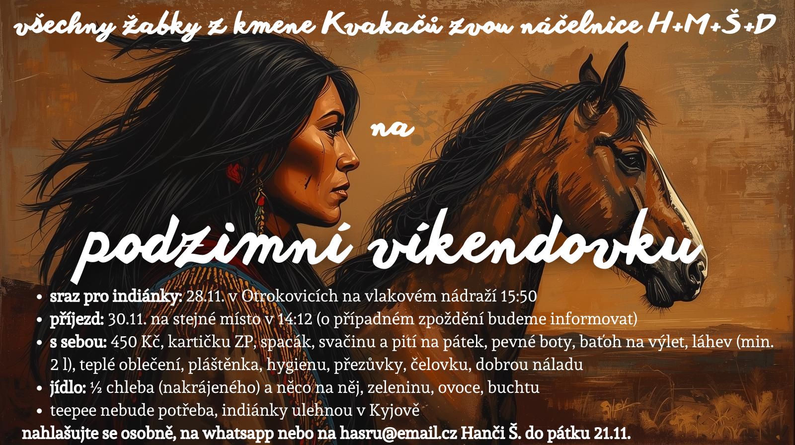 Všechny indiánky kmene Kvakačůjsou zvány na podzimní víkendovku od náčelnic (vedoucích žabek). KDY? 28.-30.11.KDE? sraz 15:50 na Otrokovickém nádraží, spát ... pokračovat ve čtení