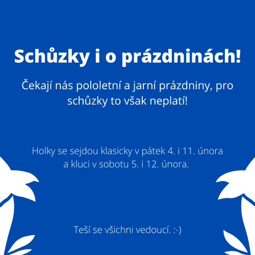 Čekají nás pololetní a jarní prázdniny, pro schůzky to však neplatí! Holky i kluci se sejdou jako obvykle. :-) ... pokračovat ve čtení